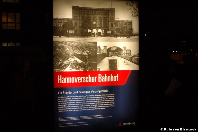 Am ehemaligen Hannoverschen Bahnhof wurden am 25. Oktober 1941 1.034 Menschen in einen Zug gepresst und nach Litzmannstadt (Lodz) deportiert. Nur 18 Menschen aus diesem Transport überlebten.
